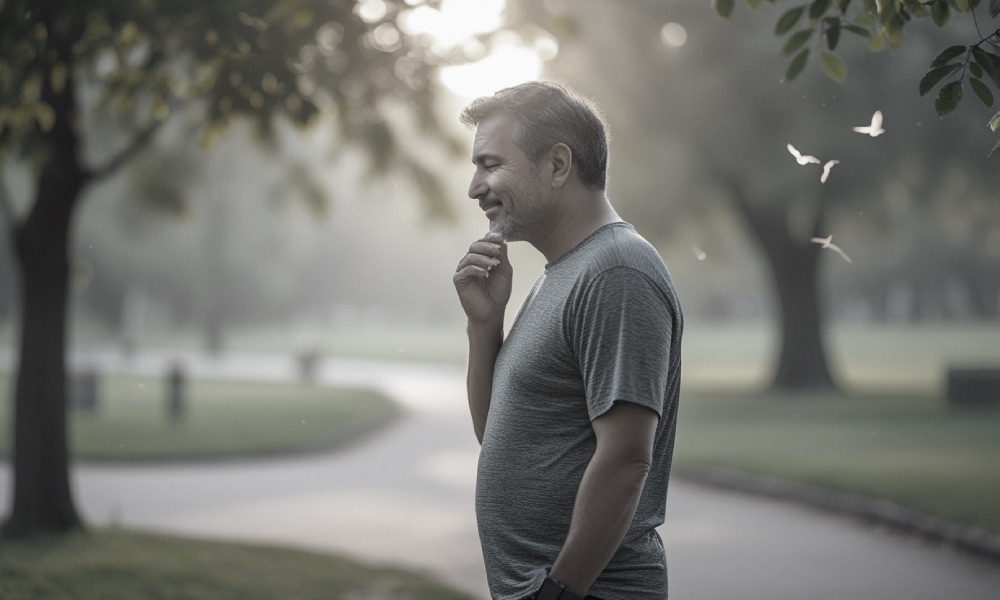 Mężczyzna zadowolony w parku - grafika wiodąca do artykułu jak obniżyć poziom kortyzolu